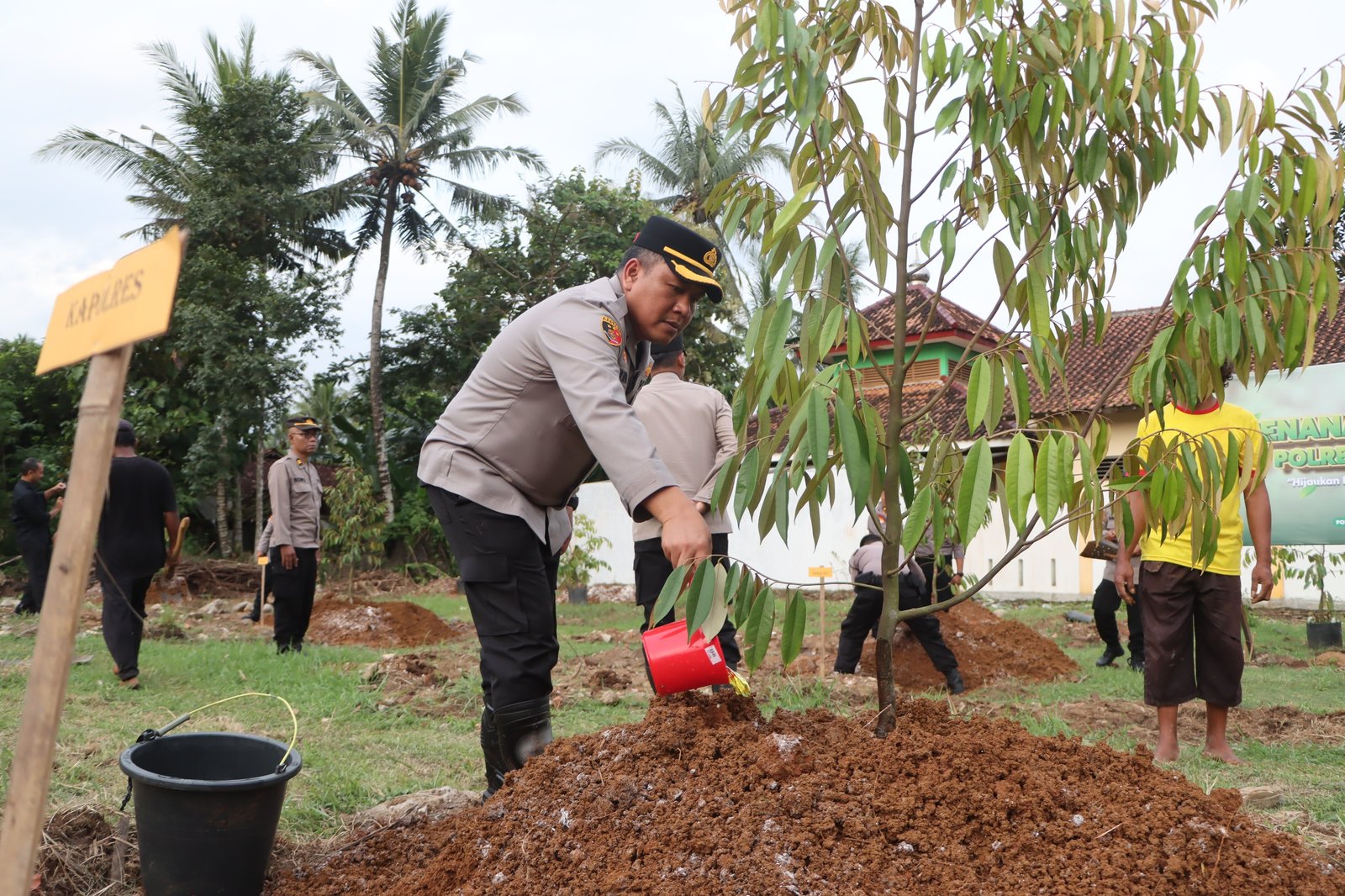 “Kami menanam sekitar 30 pohon durian dari sisi belakang hingga depan. Pohon ini tidak hanya memberi penghijauan, tetapi ke depan buahnya juga dapat dimanfaatkan dan memiliki nilai ekonomis bagi anggota,” jelas AKBP Windy Syafutra.